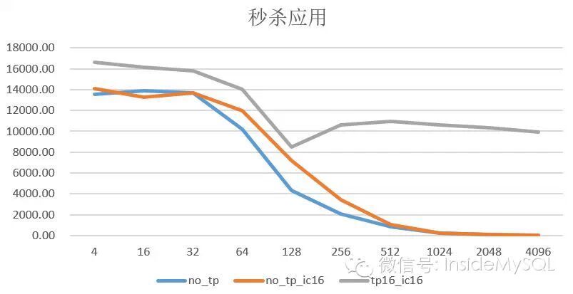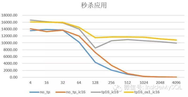 但是线程池这里有个参数thread_pool_oversubscribe,这个参数其实有点类似云计算中“超售”概念,即MySQL的线程池允许有额外的线程运行。该参数默认是3,之前thread_pool_size设置为16,那么总共允许16*(1+3)=64个线程同时运行。这个参数的默认值本身没有问题,但是对于秒杀应用来说确是不需要的,因为之前已经讨论过,秒杀应用是串行的。所以将参数thread_pool_oversubscribe设置为1,秒杀应用还能有进一步的提升: