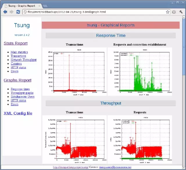 除此之外,Tsung 还可以在 html 上产生图表以及输入你的测试的详细报告。测试的结果通俗易懂,并且你甚至可以把这些图片展示给你的 boss 看!