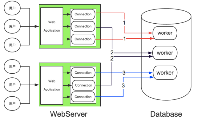 连接池通常实现在Client端,是指应用(客户端)创建预先创建一定的连接,利用这些连接服务于客户端所有的DB请求。如果某一个时刻,空闲的连接数小于DB的请求数,则需要将请求排队,等待空闲连接处理。通过连接池可以复用连接,避免连接的频繁创建和释放,从而减少请求的平均响应时间,并且在请求繁忙时,通过请求排队,可以缓冲应用对DB的冲击。线程池实现在server端,通过创建一定数量的线程服务DB请求,相对于one-conection-per-thread的一个线程服务一个连接的方式,线程池服务的最小单位是语句,即一个线程可以对应多个活跃的连接。通过线程池,可以将server端的服务线程数控制在一定的范围,减少了系统资源的竞争和线程上下文切换带来的消耗,同时也避免出现高连接数导致的高并发问题。连接池和线程池相辅相成,通过连接池可以减少连接的创建和释放,提高请求的平均响应时间,并能很好地控制一个应用的DB连接数,但无法控制整个应用集群的连接数规模,从而导致高连接数,通过线程池则可以很好地应对高连接数,保证server端能提供稳定的服务。如图2所示,每个web-server端维护了3个连接的连接池,对于连接池的每个连接实际不是独占db-server的一个worker,而是可能与其他连接共享。这里假设db-server只有3个group,每个group只有一个worker,每个worker处理了2个连接的请求。
