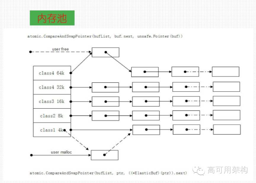 上图左边的数组实际上是一个列表,这个列表按大小将内存分块,然后使用atomic操作进行CAS。但实际要看测试数据了,池技术可以明显减少临时对象和内存的申请和释放,gc时间会减少,但加锁带来的并行度的降低,是否能给一段时间内的整体吞吐量带来提升,要做测试和权衡…