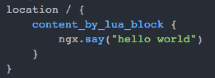 - 代码编写需要修改 nginx.conf 和对应的 lua 代码,即使是 hello world 也是如此。当然你可以把代码写在 nginx 的配置文件里面,但是生产环境肯定是要分离的。这种编写代码的方式,不像是一个编程语言,和常规的编程方式不同。