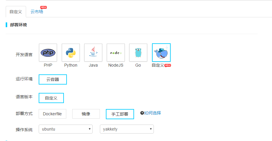 访问 http://sae.sina.com.cn/?m=apps&a=create ,语言选择“自定义”,部署方式选择“手工部署”,操作系统选择“Ubuntu”即可,如图所示: